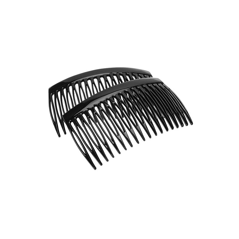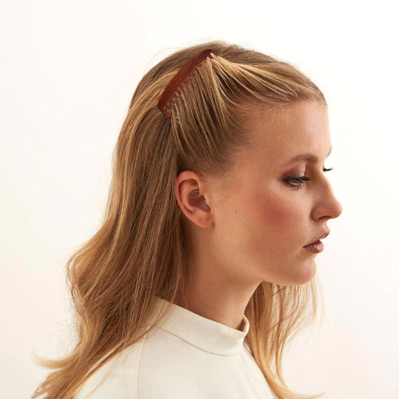 De haarspeld vormt zich naar de natuurlijke contouren van het hoofd en gaat naadloos op in het kapsel. Hij zit stevig, voelt zacht aan in het haar en houdt alles op zijn plaats zonder te trekken of irritatie te veroorzaken.